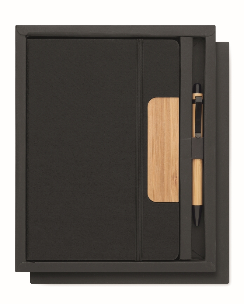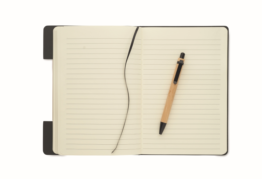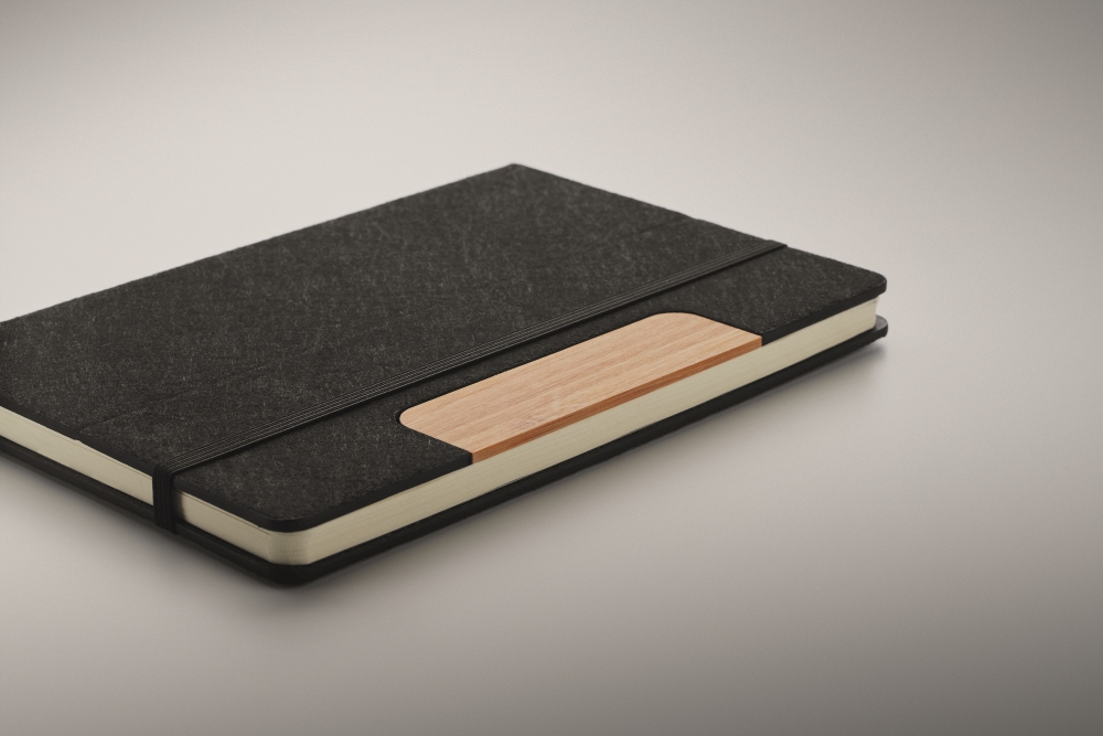 A5 RPET felt hard cover notebook set with phone stand functionality and push ball pen with bamboo barrel. Case bound. 160 recycled paper lined pages (80 sheets). Elastic closure strap. Ribbon bookmark. Blue ink. Dimensions: 19,5 x 1.8 x 23,8 cm