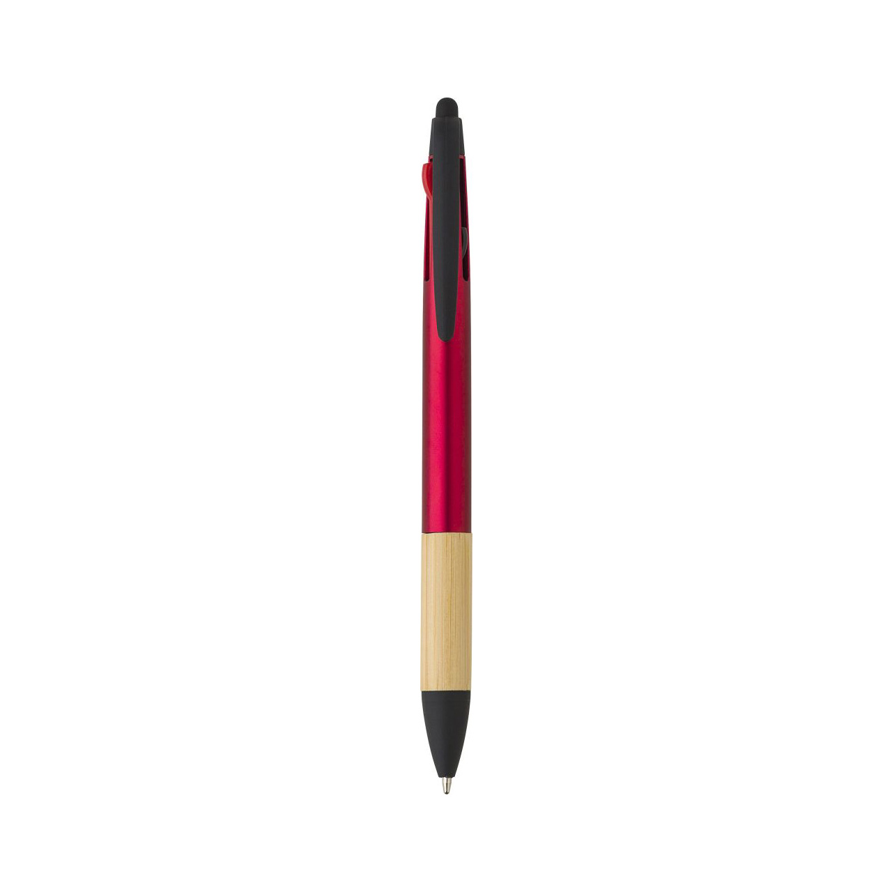 ABS 3 colour ink ballpen with bamboo grip and stylus tip. Ink colours: red, blue, black.