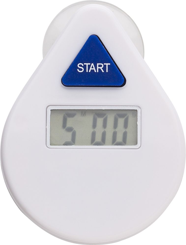 ABS digital shower timer with suction cap on the back, and push button on the front.