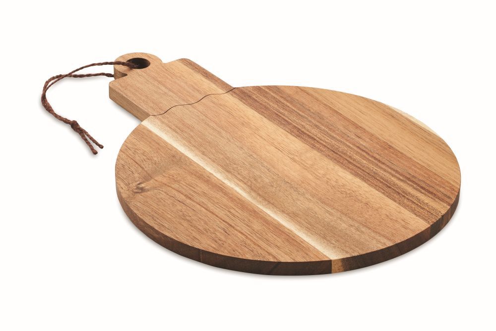 Acacia wood serving board with in Christmas bauble shape with PU cord. Wood is a natural product, there may be slight variations in colour and size per item, which can affect the final decoration outcome.