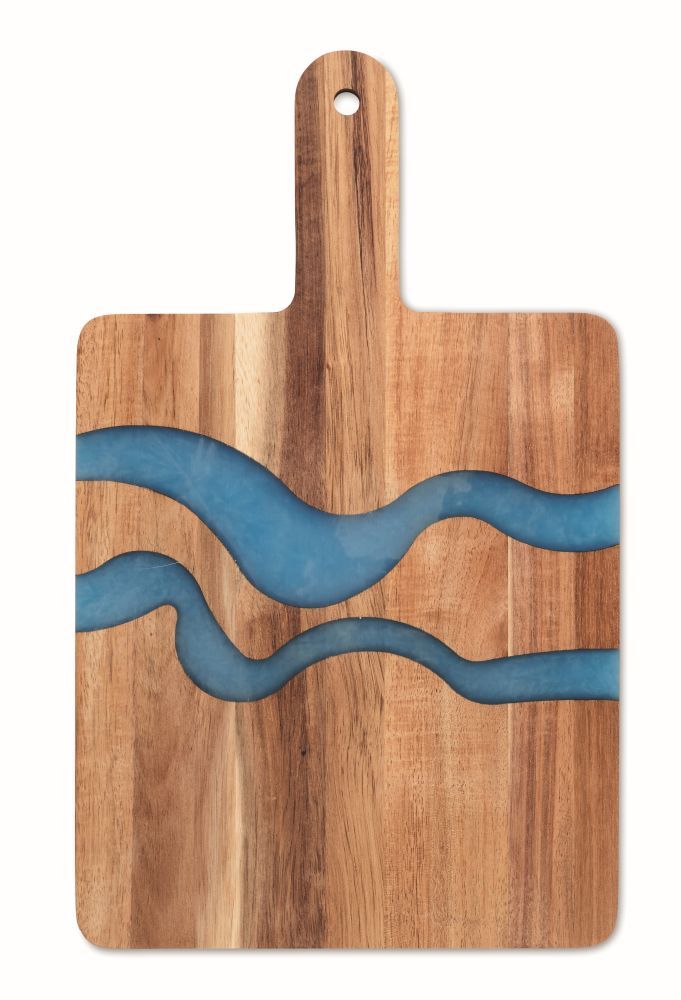 Acacia wood serving board with epoxy resin detail and handle. Wood is a natural product, there may be slight variations in colour and size per item, which can affect the final decoration outcome.