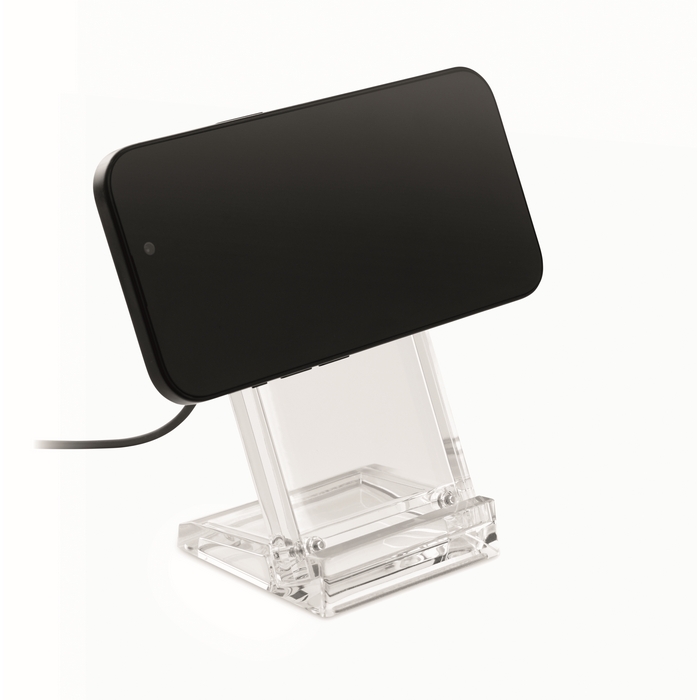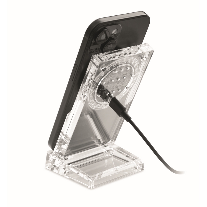 Wireless charger (15W) in acrylic with phone stand. When connected to a power source, it will charge your mobile device. Output: 9V/1.67A (15W) for quick charging.Dimensions: 12,4 x 6,9 x 7,1cm