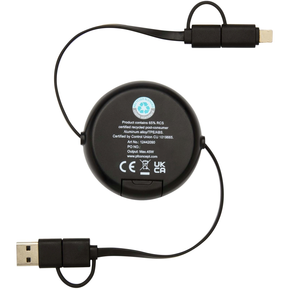 Alasia 5-in-1 100 cm recycled plastic and aluminium retractable data sync and 45W fast charge cable, solid black