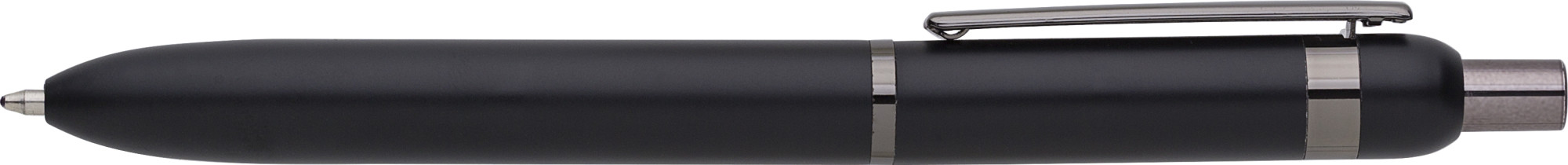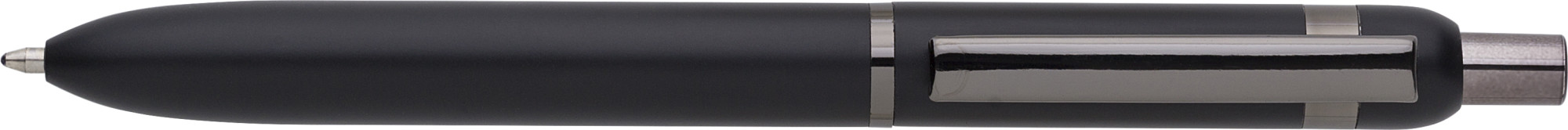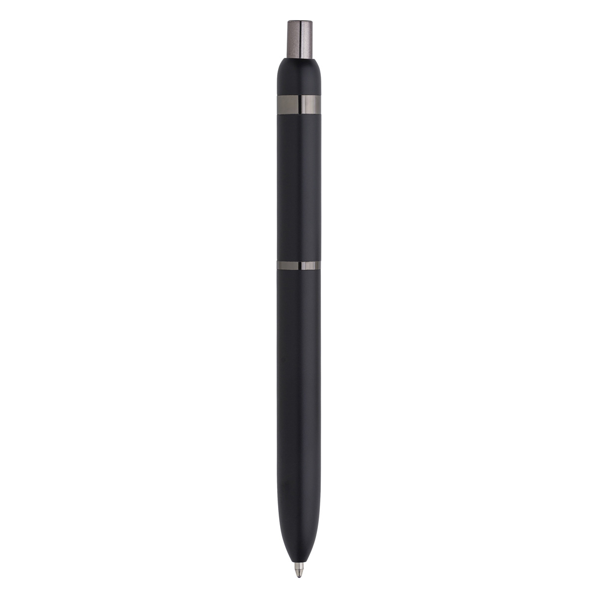 Aluminium and brass ballpen. With shiny details on the clip, ring, and push button. Blue ink. Individually packaged in magnetic giftbox with paper sleeve.