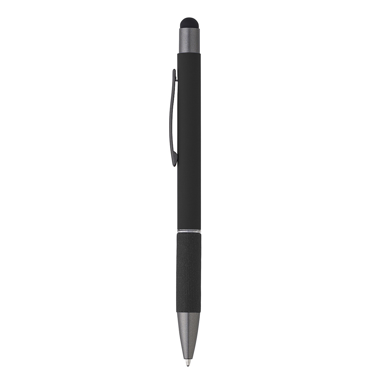 Aluminium ballpen with rolled paper details on the grip. Rubber tip for capactive screens. Blue ink.