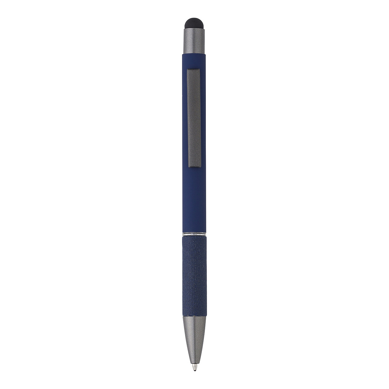 Aluminium ballpen with rolled paper details on the grip. Rubber tip for capactive screens. Blue ink.