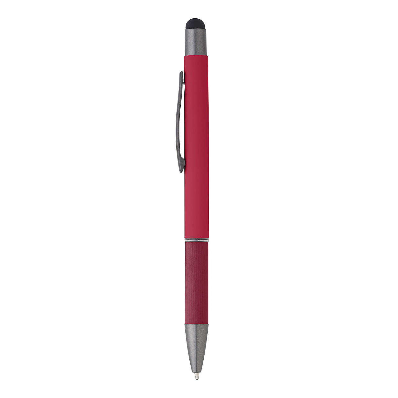 Aluminium ballpen with rolled paper details on the grip. Rubber tip for capactive screens. Blue ink.