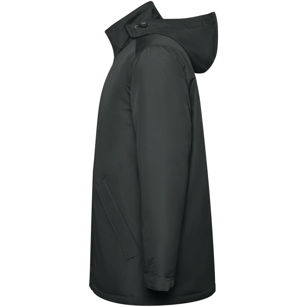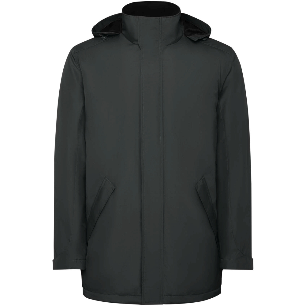 Waterproof padded parka jacket for men. High collar with folded and removable hood with hook & loop closure. Matching central zipper with flap. Side pockets with zipper and fixed flap. Interior pocket with hook & loop closure. Adjustable cuffs with hook & loop belt loop. Interior access for reinforcements on the back and left chest.