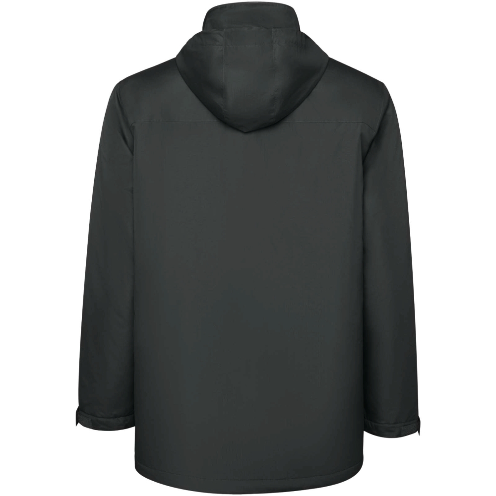 Waterproof padded parka jacket for men. High collar with folded and removable hood with hook & loop closure. Matching central zipper with flap. Side pockets with zipper and fixed flap. Interior pocket with hook & loop closure. Adjustable cuffs with hook & loop belt loop. Interior access for reinforcements on the back and left chest.