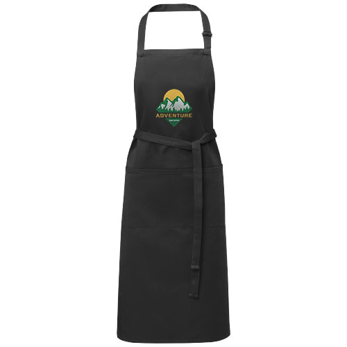 Protecting beautiful clothes while cooking is easy with the Andrea apron. The apron consists of 240 g/m2 twill (65% polyester and 35% cotton), which makes it thick and sturdy, while still soft and comfortable to wear. The two front pockets offer a quick and easy way to store kitchen essentials. The apron is adjustable with a buckle around the neck and a tie back closure, making it one-size-fits-all. Multiple large print options for maximum logo exposure.