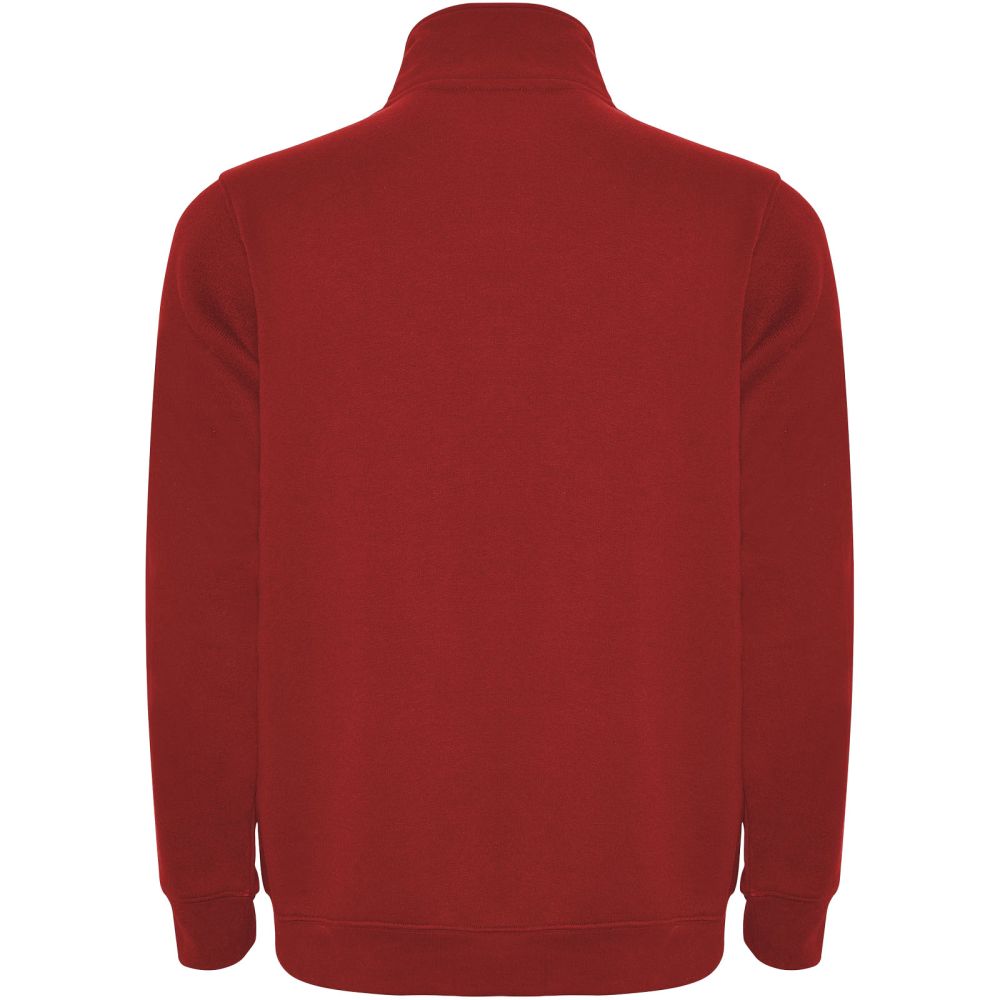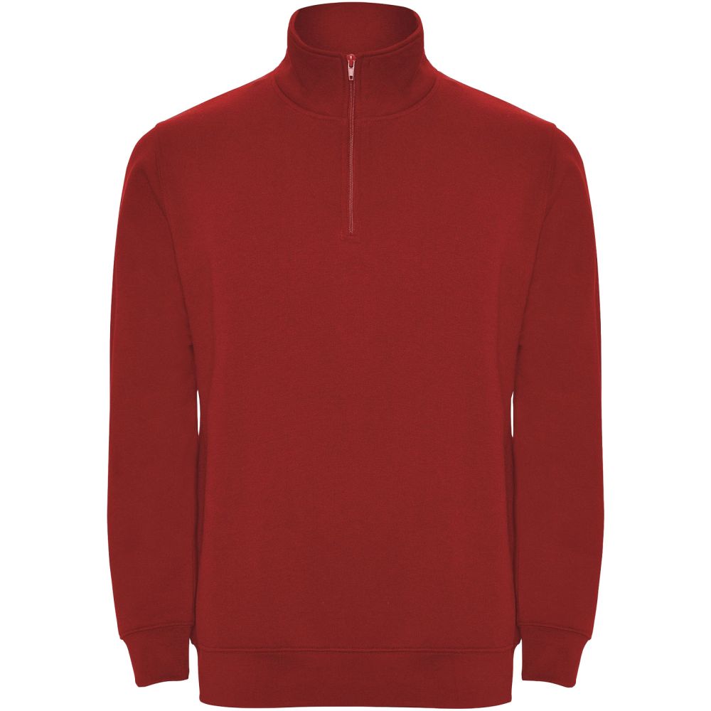 Sweatshirt with matching half zip and polo neck. Matching inner collar. Reinforced covered seams on inner collar. 1x1 ribbed cuffs and waist. The model is 185 cm and is wearing size M.