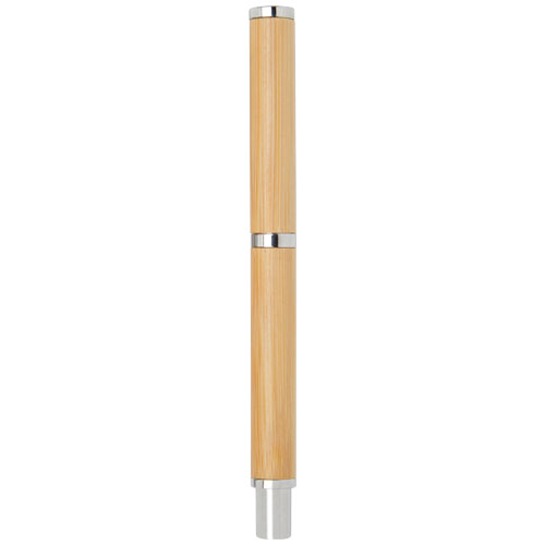 Ballpoint and rollerball pen gift set with pen barrels made of bamboo. Bamboo is a renewable resource, and a more sustainable choice for pen manufacturing. Other components in this pen set are made of shiny chromed recycled brass. Recycling brass helps reduce the need for extracting and refining new raw materials, which conserves natural resources. By opting for a pen set made of bamboo barrel and recycled brass, you support more sustainable sourcing and recycling practices. It allows you to enjoy writing instruments that are both stylish and mindful of the environment. Delivered with a kraft paper box with a yellow silk ribbon. Pen ink colour: Black. Box size: 16.8 x 7 x 2.7 cm.