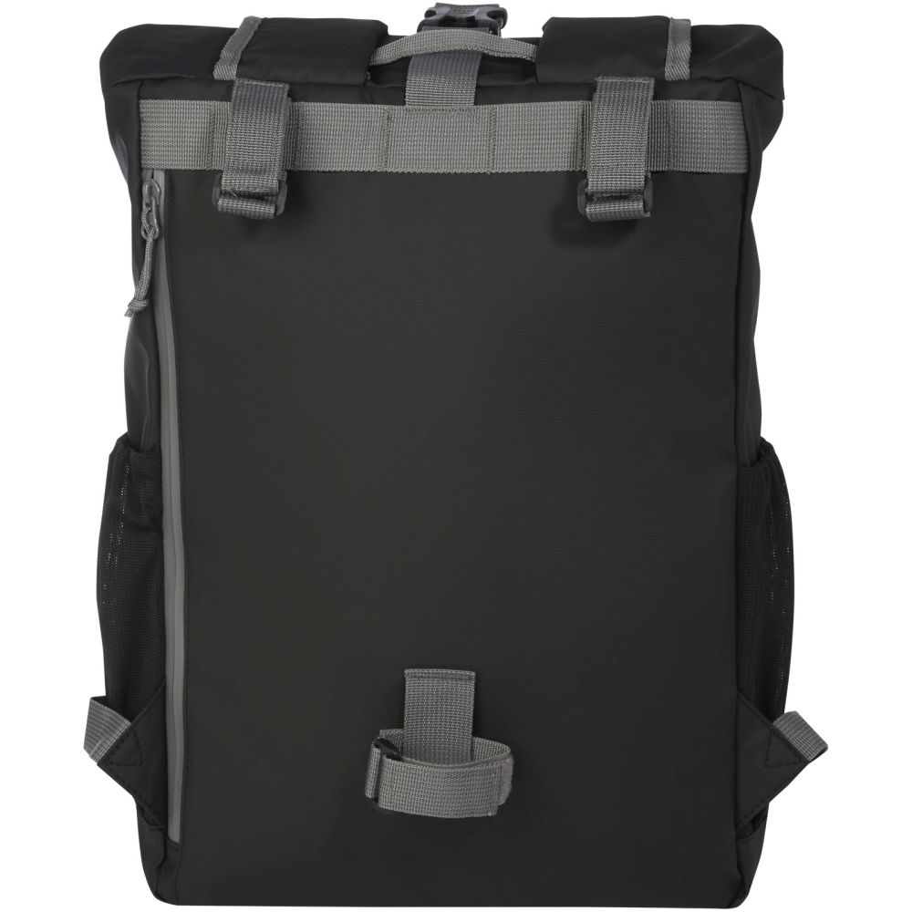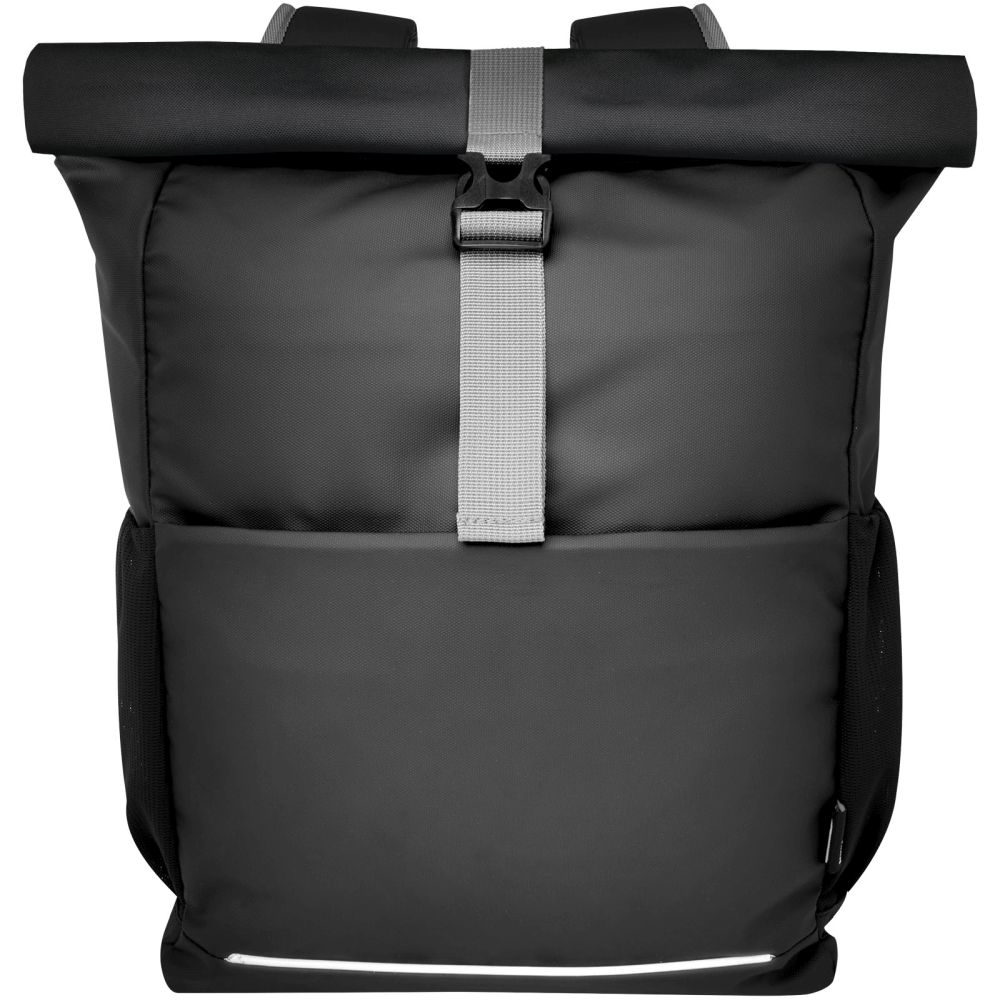 Water-resistant roll-top bike bag made from GRS certified recycled materials. It features a padded 15" laptop compartment, multiple organisational pockets, adjustable hook & loop closure for easy fitting onto a variety of bikes, and reflective piping for visibility. The GRS recycled materials include the main fabric, lining, webbing, and zips. Capacity: 20 litres. PVC free.