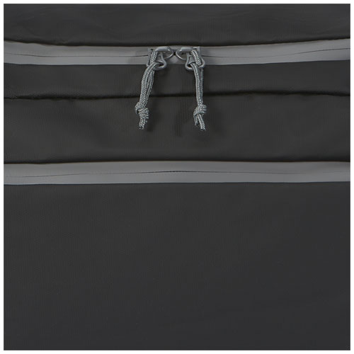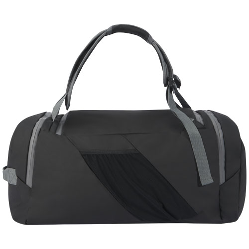 Water-resistant 2-in-1 duffel backpack made from GRS certified recycled materials, including the zips. It features a spacious main compartment with U-shaped opening for easy storage and access, two side zipped pockets (including a compartment for shoes), one zipped front pocket, a mesh water pocket on the back, and reflective piping for visibility. This bag can be carried in 3 different ways: By hand, over the shoulder, or as a backpack with its padded and adjustable shoulder straps. The GRS recycled materials include the main fabric, lining, webbing, and zips. Capacity: 35 litres. PVC free.