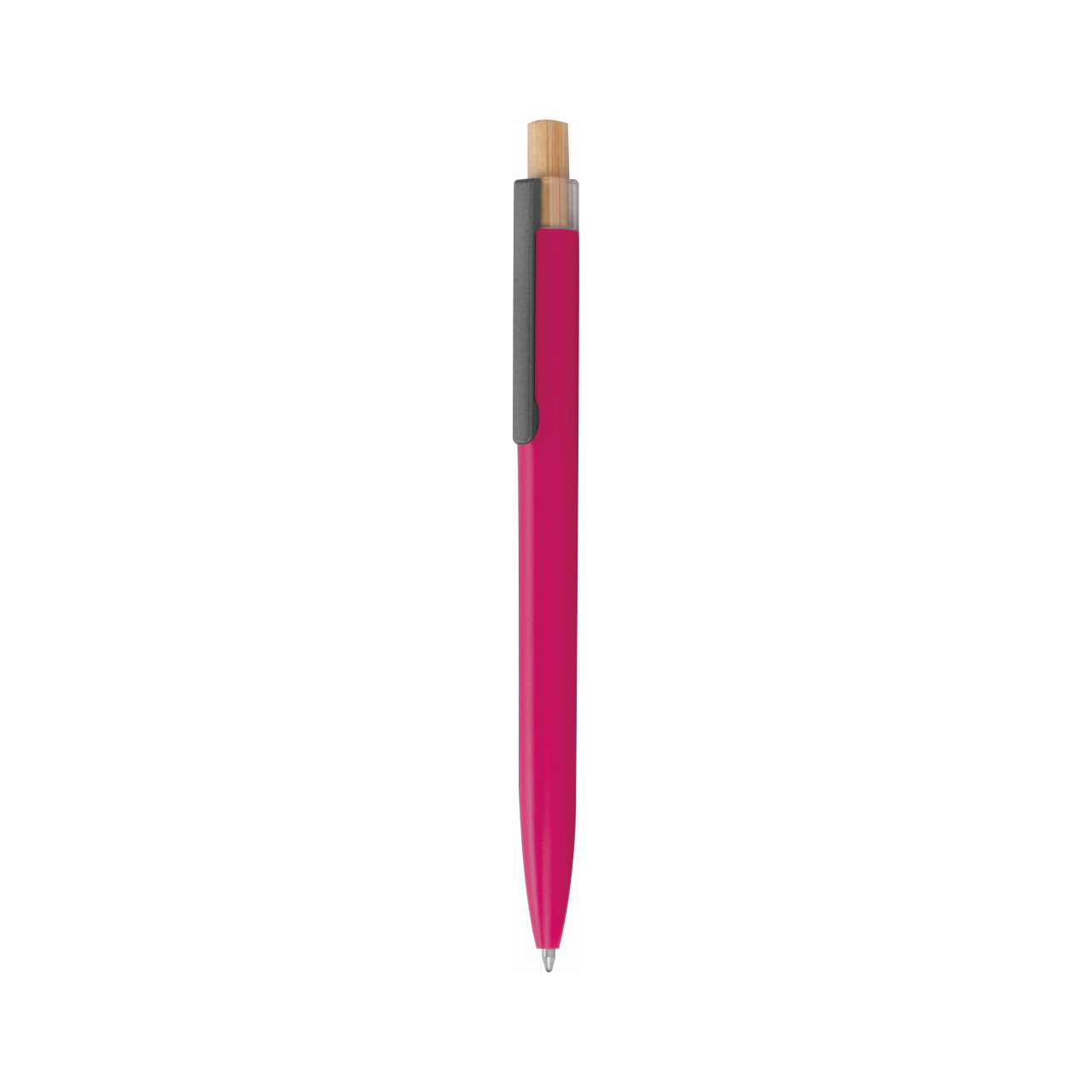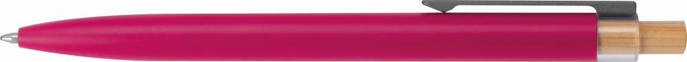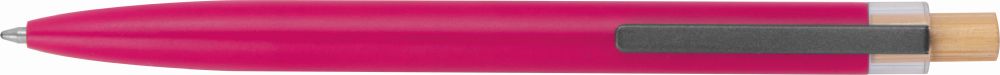 Recycled aluminium ballpen with metal clip, blue refill and bamboo pusher. Your logo will be engraved below the clip.