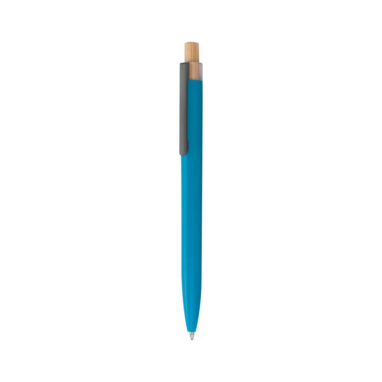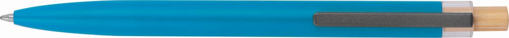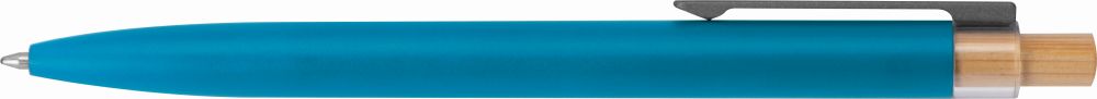 Recycled aluminium ballpen with metal clip, blue refill and bamboo pusher. Your logo will be engraved below the clip.