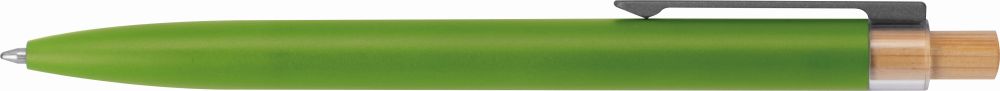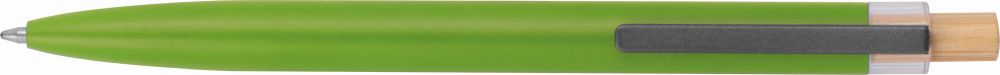 Recycled aluminium ballpen with metal clip, blue refill and bamboo pusher. Your logo will be engraved below the clip.