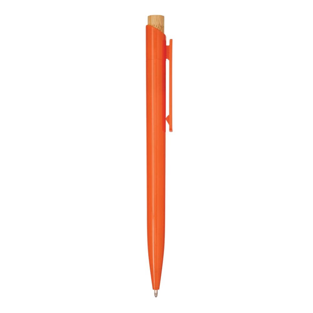 Ballpoint pen: barrel made from recycled plastic, push mechanism, pusher made of bamboo, blue ink. Dimensions: 13,5 cm