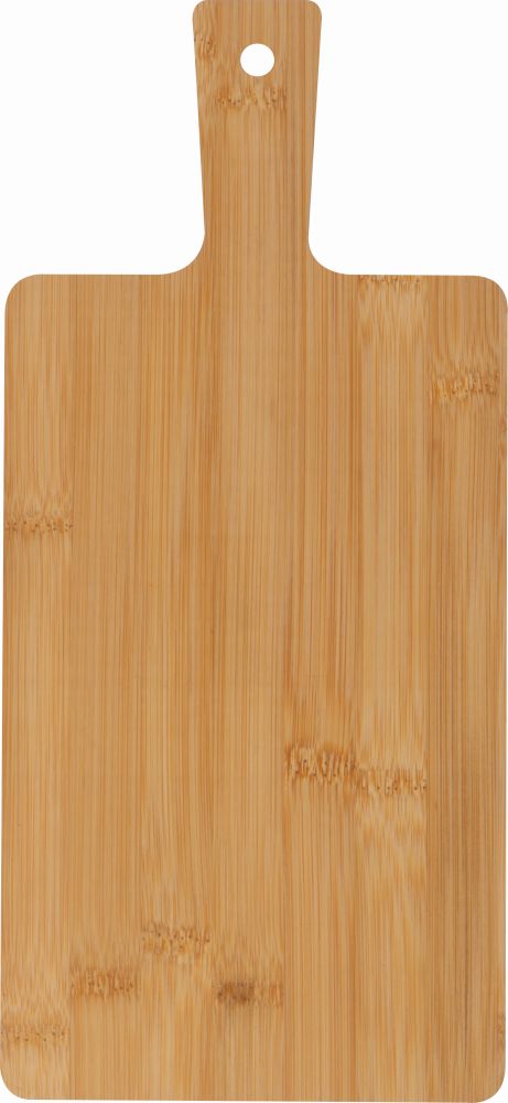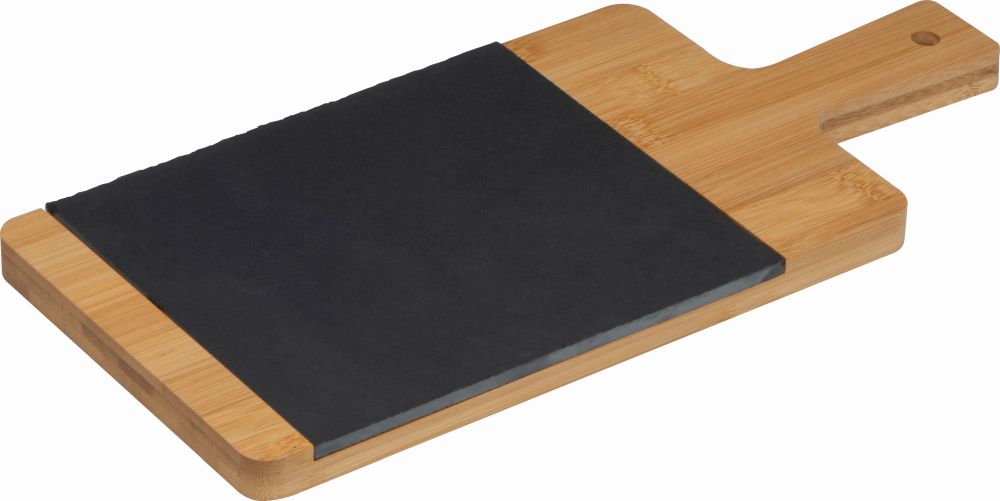Bamboo serving board with slate insert, carrying handle and eyelet for hanging. We engrave your logo on the bamboo surface.