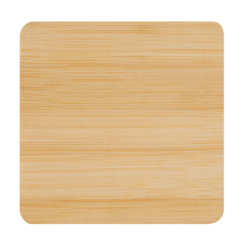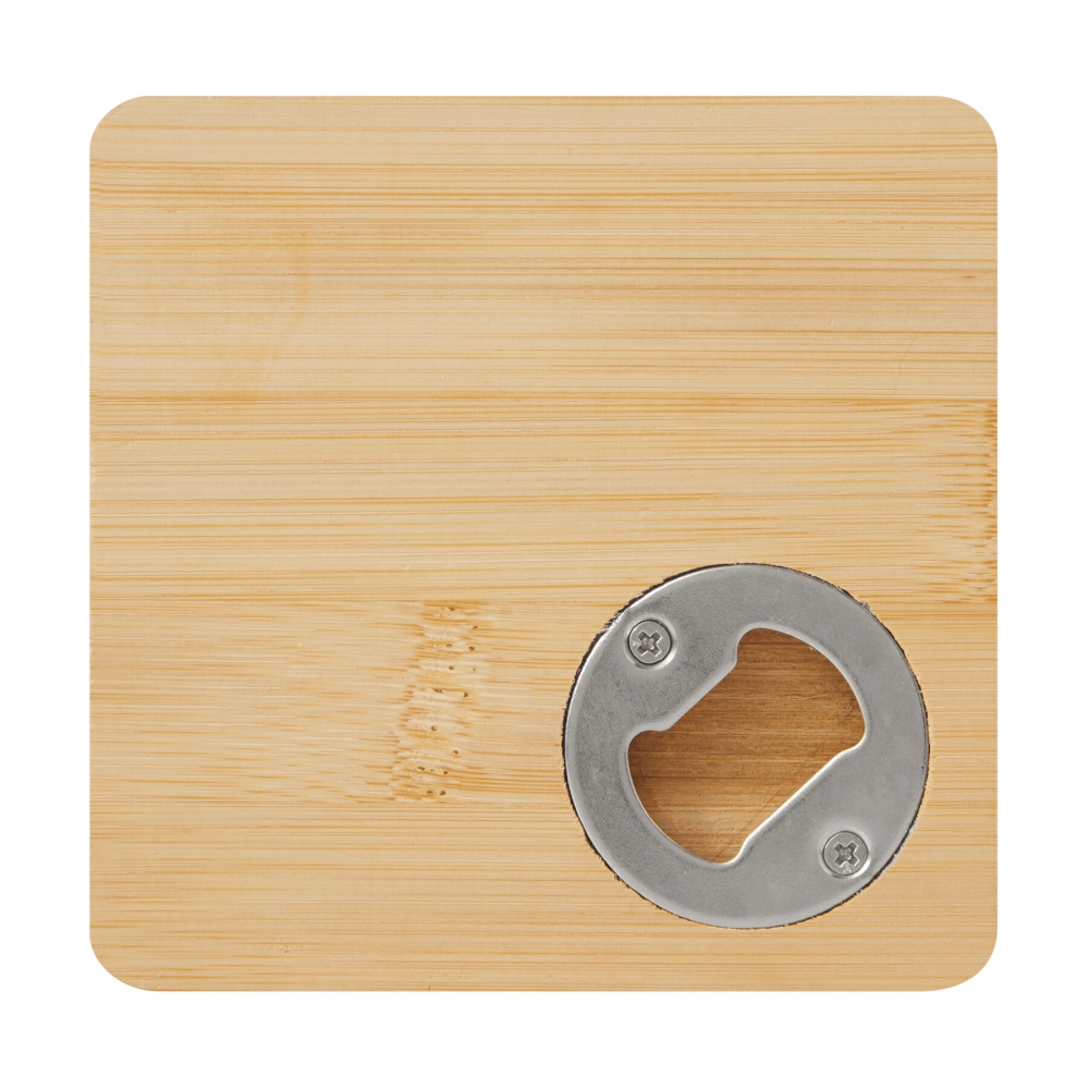 Bamboo coaster: integrated bottle opener, large imprint area for your logo. Dimensions: 9,8 x 9,8 x 0,9 cm