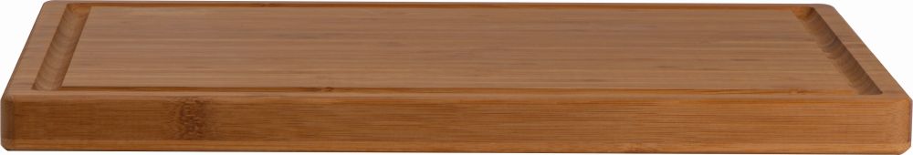 Solid bamboo cutting board with drip tray and carrying handles. Your logo will be engraved in one corner of the board.