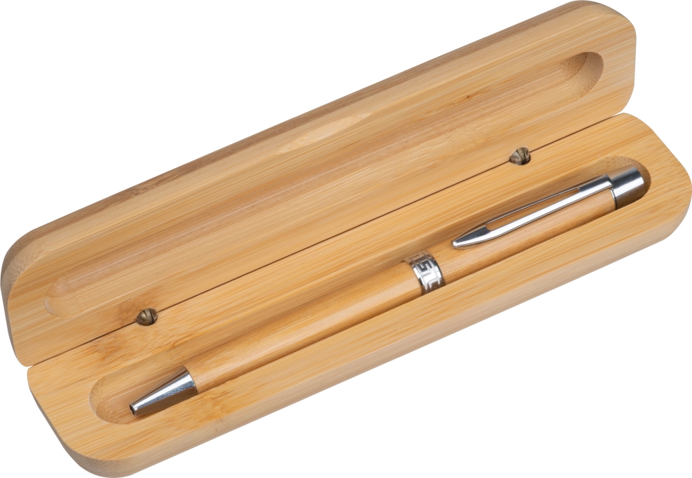 Bamboo biros with twist action and a blue-writing Crosssystem refill. Supplied in a matching bamboo case. We will engrave your logo on the biros. Dimensions: 16,8 x 4 x 2,4 cm