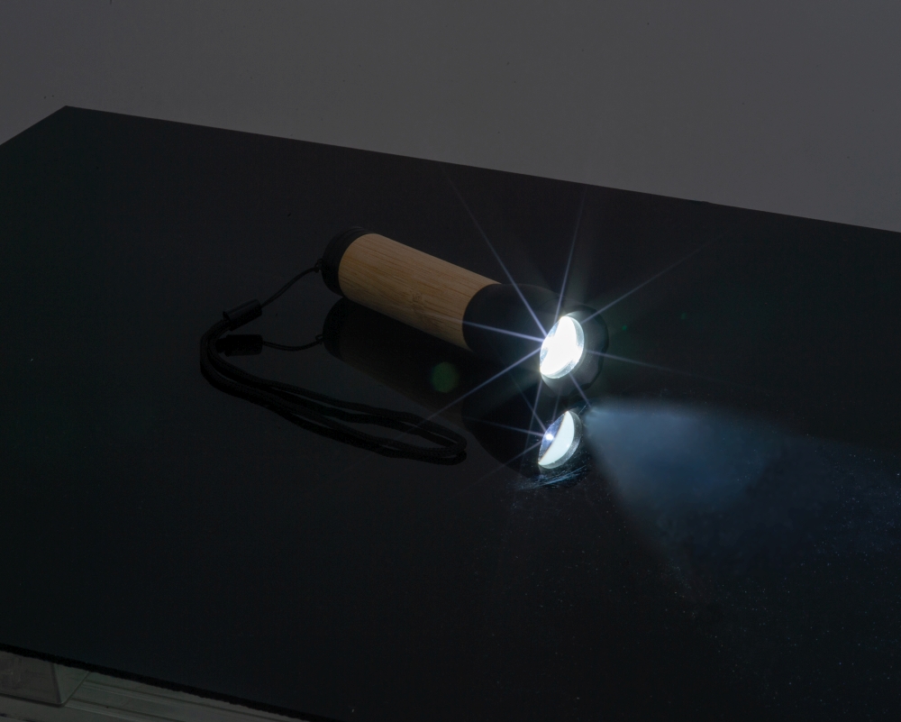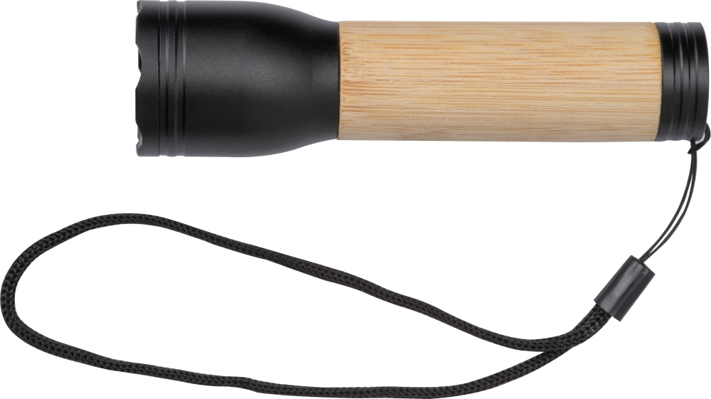 Rechargeable torch made from recycled aluminium with bamboo handle with 400 lumen brightness and a battery capacity of 300 mAh. Type C charging cable included. We will engrave your logo on the bamboo handle. Dimensions: o 3,3 x 11,5 cm