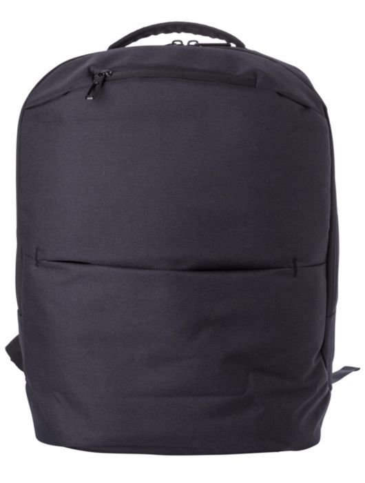 Polyester (600D) two-tone backpack. Two zippered pockets on the front side and two large zippered compartments on the top side, with one laptop compartment inside. The backpack is reinforced and includes a trolley strap. Dimensions: 33 x 17 x 45 cm.