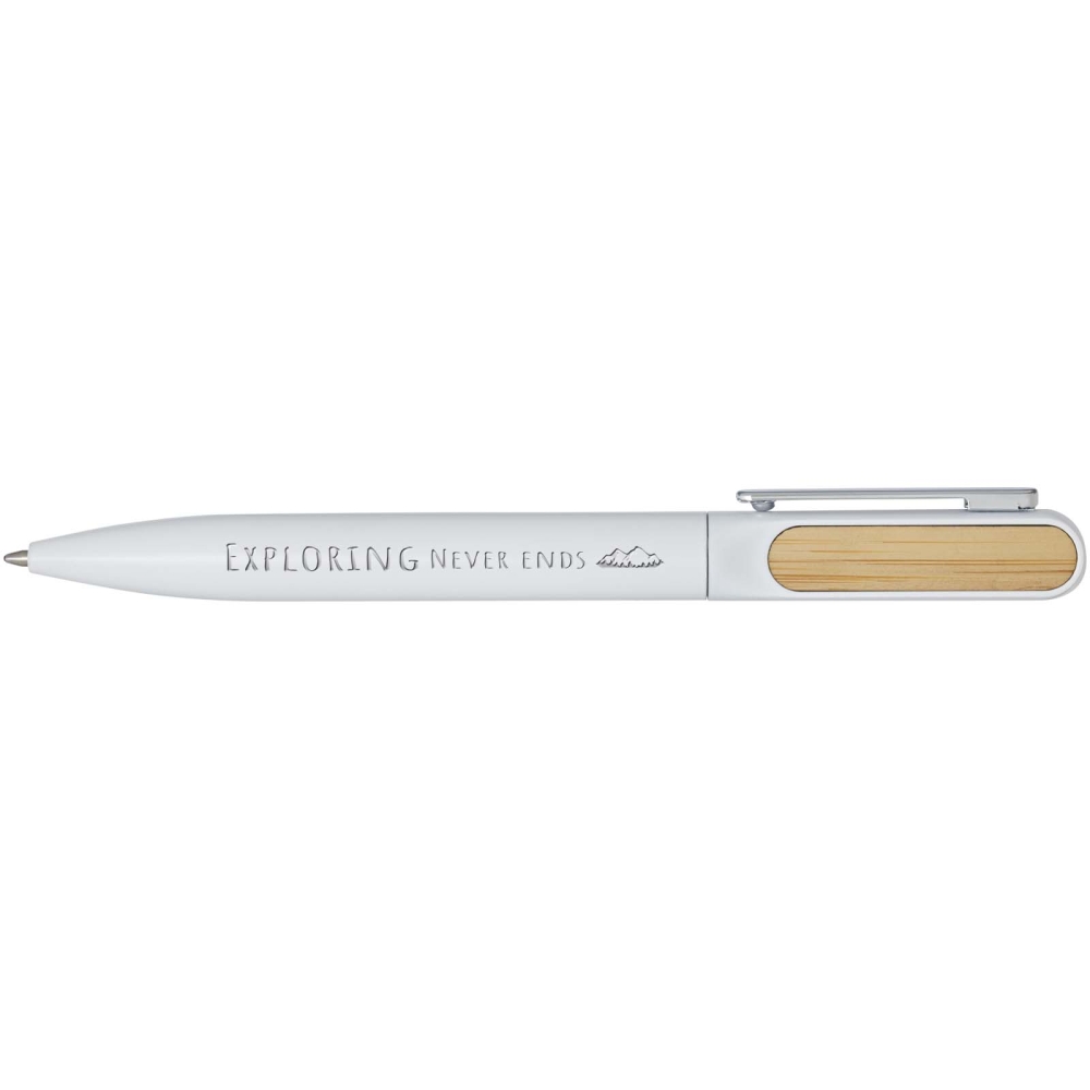 The Blanca ballpoint pen has an upper barrel made of recycled plastic with a coloured spray coating, and bamboo accessories on both sides. The lower part of the barrel is made of recycled aluminium with a coloured spray coating. Ink colour: Blue. Writing length: 400 metres. Nib size: 1.0 mm. Dimensions: 14 x O 1,2 cm