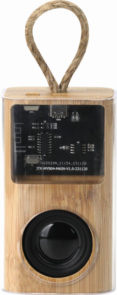 Bluetooth speaker (version 5.3) with transparent housing. Rechargeable battery (300 mAh), 3 watts output power and C-type charging cable included. Charging time approx. 2 hours / playing time approx. 1.5 hours. We print your logo on the back.