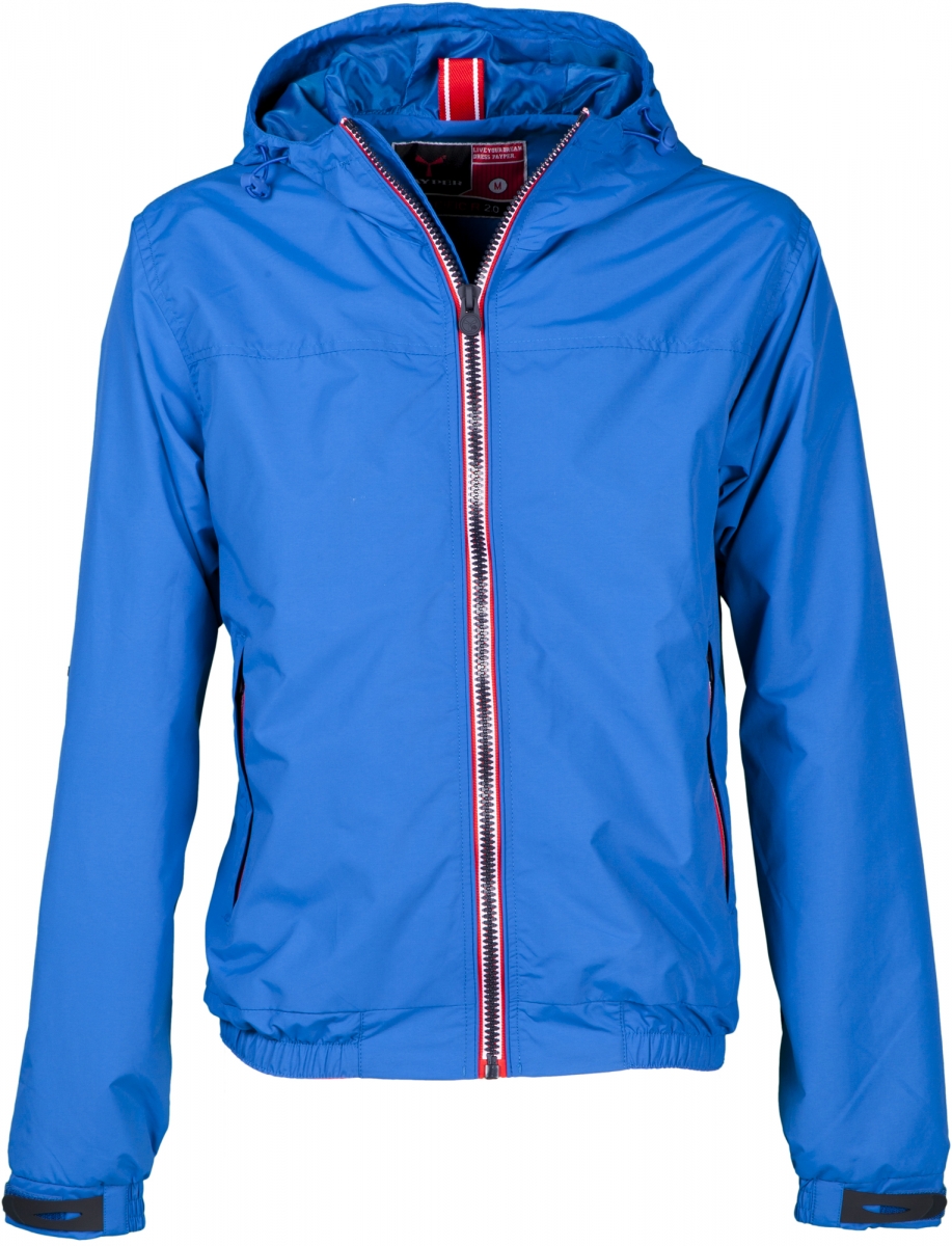 Men’s jacket with 8 mm contrasting zip, shaped hood with two seams and drawstring, elasticated waist, elasticated cuffs and rubberised adjustable wrist fastening, two outer pockets with concealed zip. Inside: unpadded, mesh lining, one inner zip pocket for smartphone with opening for headphones, zip on the back and chest for easier printing and embroidery.