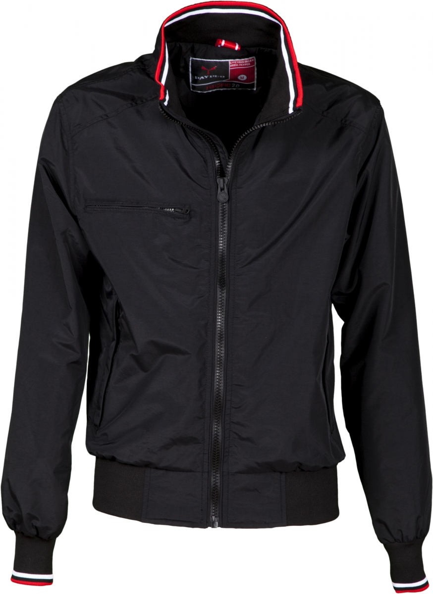 Men’s jacket, 8 mm plastic zip with metal pull, with collar, elasticated rib cuffs and waist with stripes, two outer pockets with plastic zip. Unpadded, mesh lining, one inner zip pocket for smartphone with opening for headphones, zip on the chest and back for easier printing and embroidery.