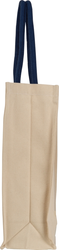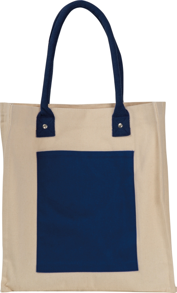 Carrier bag made of robust and sustainable canvas fabric (320 g/m2) with long handles and stable bottom gusset for a secure stand. Small insert pocket on the front in matching colours to the handles. Your logo will be printed on the pocket. Dimensions: 35 x 13 x 38 cm
