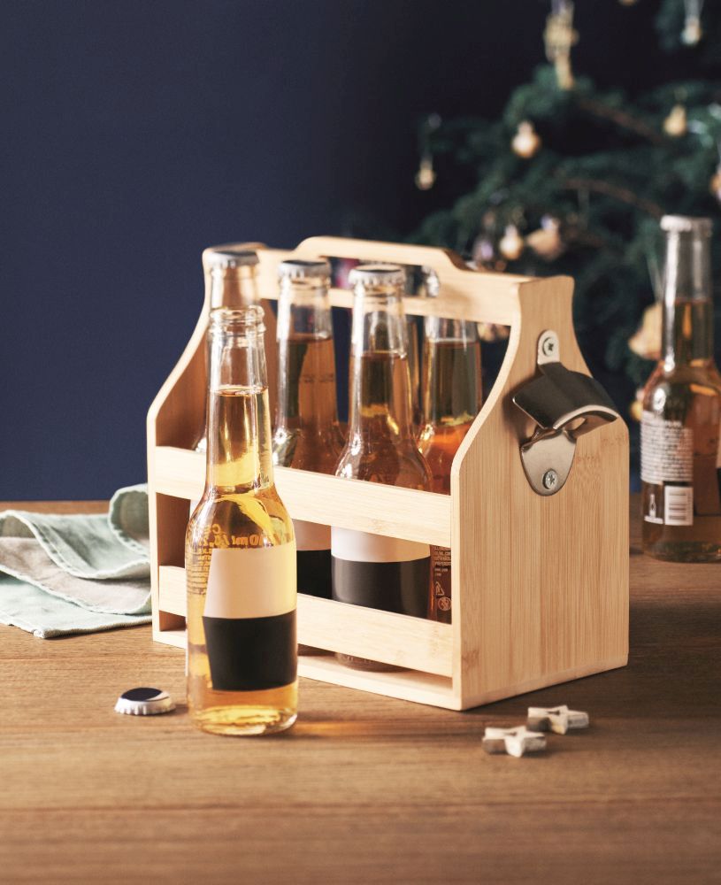 Carry crate in bamboo including a metal bottle opener. It fits 6 traditional glass beer bottles. Bamboo is a natural product, there may be slight variations in colour and size per item, which can affect the final decoration outcome.