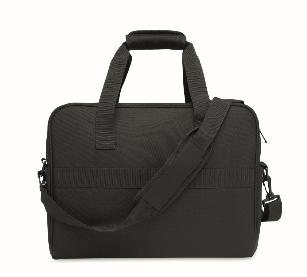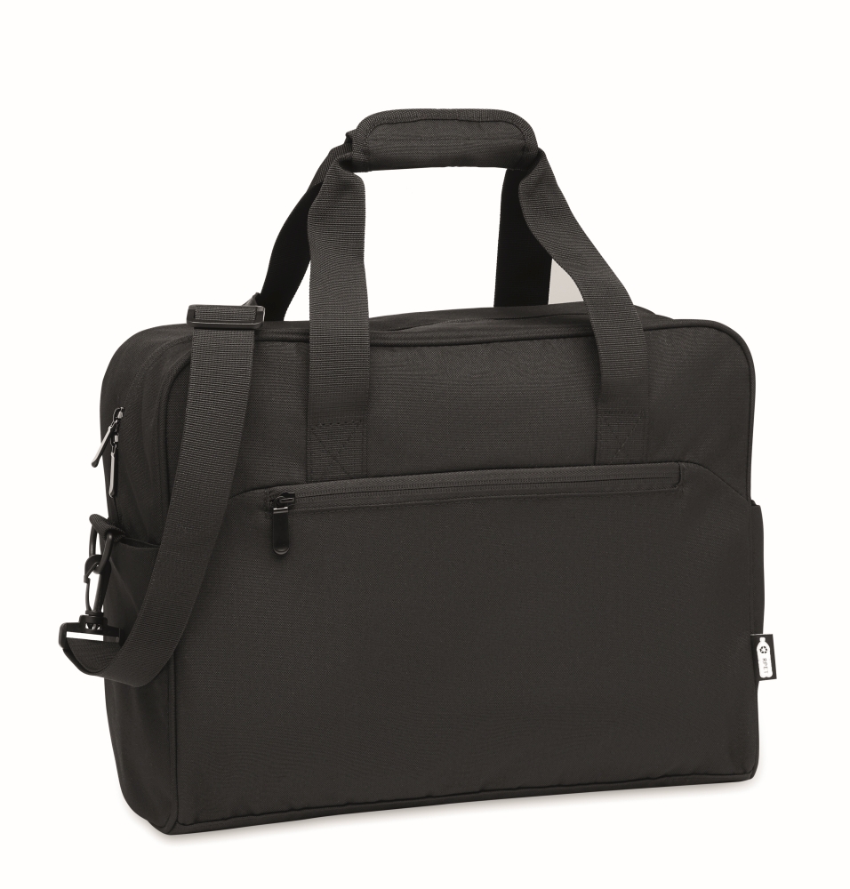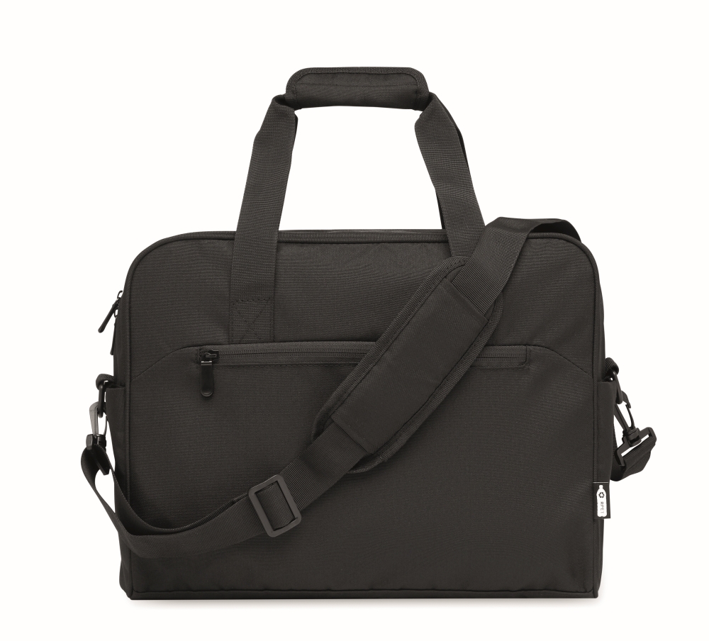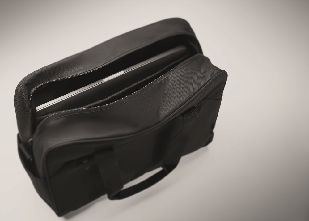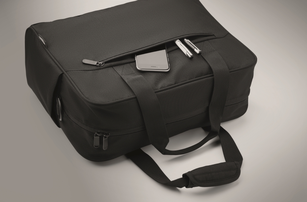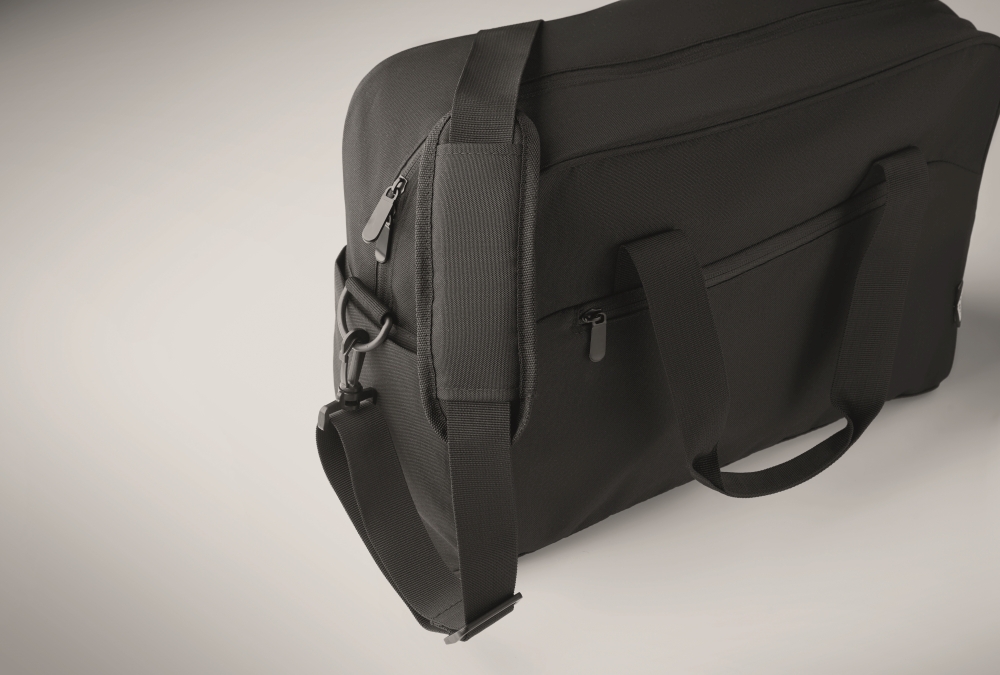 Carry-on hand luggage travel bag in 600D RPET with large zippered front pocket, two small side pockets. Includes 15 inch laptop compartment. Padded removable and adjustable shoulder strap. Trolley holder on reverse side. Dimensions: 40 x 15 x 30 cm