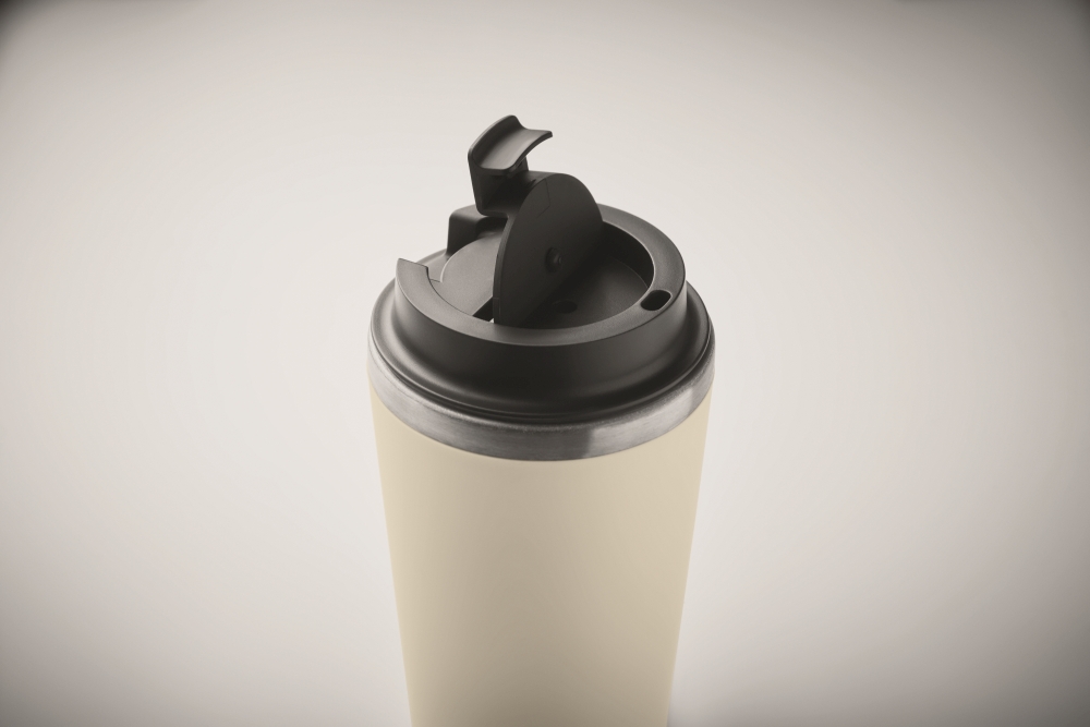 Double wall tumbler in PP outer wall with inner wall in recycled stainless steel (90% recycled stainless steel and 10% stainless steel) with a ceramic inner lining. Leak-free. Capacity: 350 ml. Dimensions: O 8,5 x 14 cm