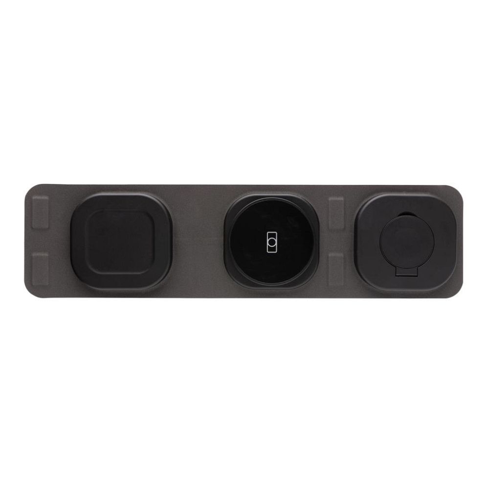 Luxury and foldable 3-in-1 wireless charger made with RCS recycled ABS Total recycled content: 38% based on total item weight. RCS certification ensures a completely certified supply chain of the recycled materials. The wireless charger comes equipped with a magnetic 15W wireless charger and an additional 5W wireless charger suitable for earbuds cases or other small wireless chargeable devices and a 2.5W wireless charger for smartwatches ( Apple watches only). Including RCS certified 120 cm recycled TPE cable. Packed in FSC® mix kraft packaging. Item and accessories 100% PVC free. Input: 9V/3A for optimal use. Output: Phone: 9V/1.1A; 9V/1.67 A/(15W), Earbuds: 5V/1A (5W), Watch: 5V/0.5A.
