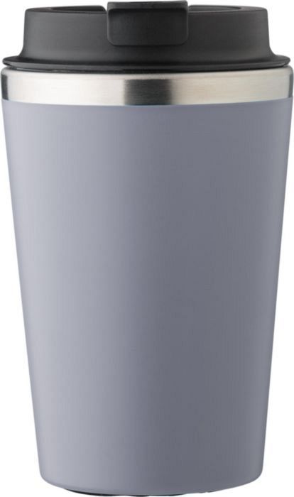 Stainless steel and PP travel mug (350 ml). The PP lid has a silicone closing ring with a foldable closure on top. Individually packaged in a brown cardboard box. Dimensions: o 8,9 x 15 cm.