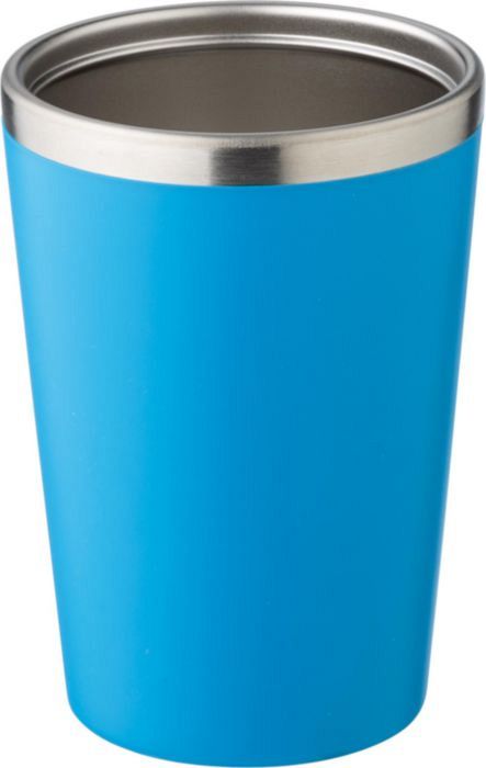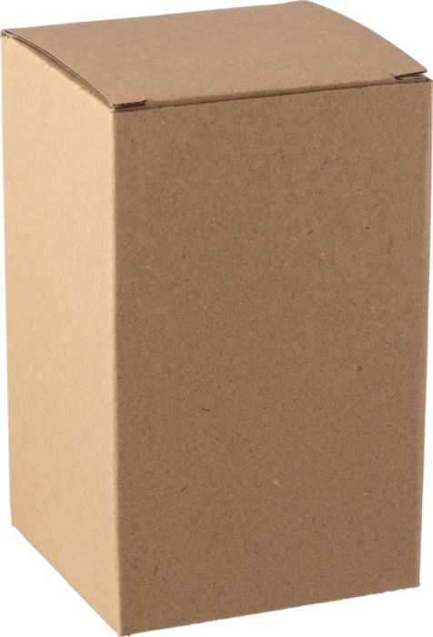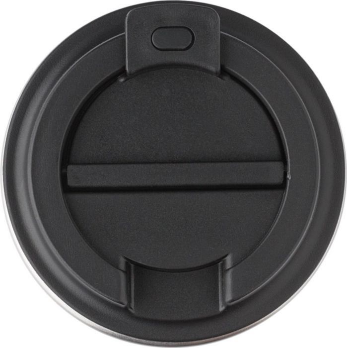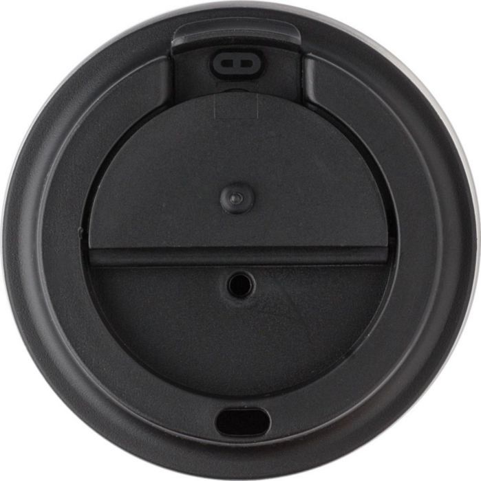 Stainless steel and PP travel mug (350 ml). The PP lid has a silicone closing ring with a foldable closure on top. Individually packaged in a brown cardboard box. Dimensions: o 8,9 x 15 cm.