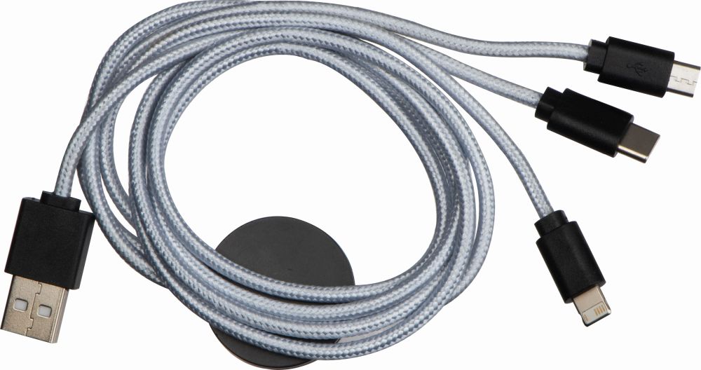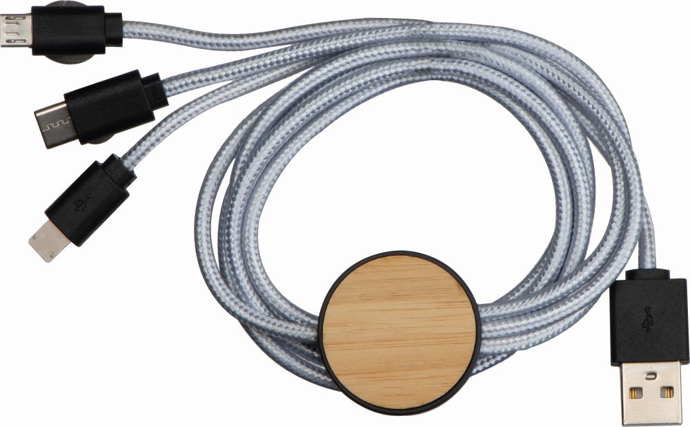 Long charging cable (1.2m) with bamboo plate and C-type, micro USB and iOS adapters. Input / output 5V/2A. We engrave your logo on the bamboo plate.