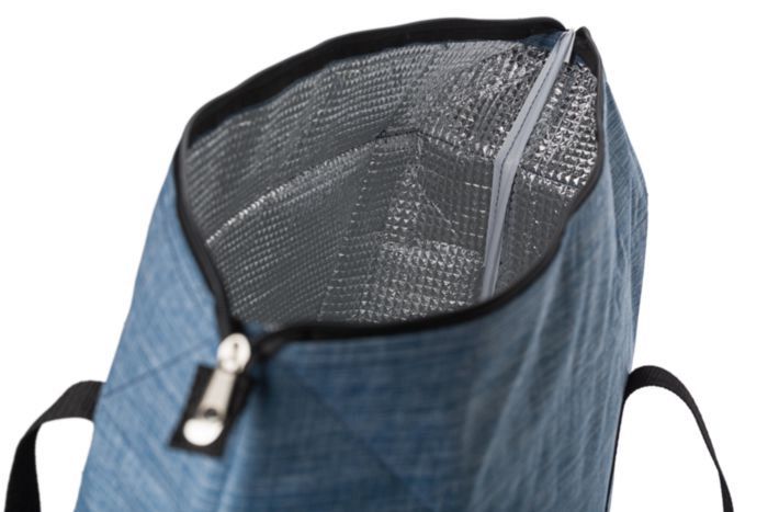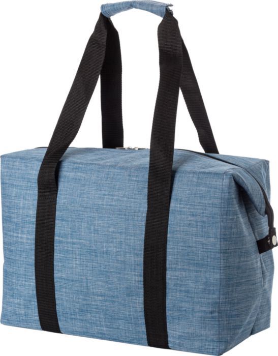 600D polyester cooler bag. One large compartment and one small pocket on the front side. Two short carrying straps with Velcro closing. Inside is foam insulated with aluminum. Dimensions: 55 x 19 x 35 cm.