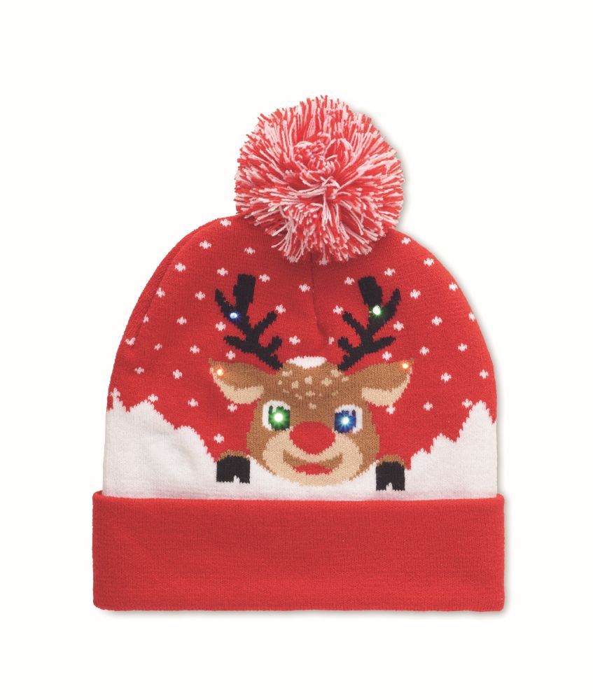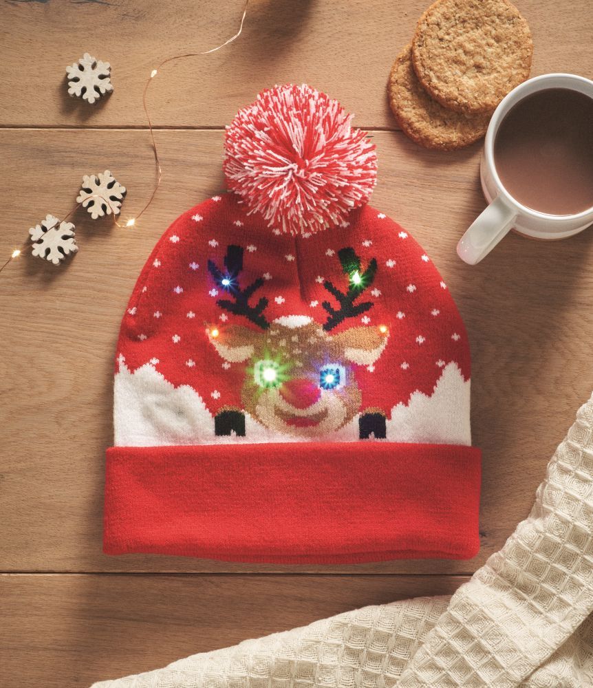 Christmas knitted beanie with 6 LED light (3 setting lights) with cuff and bobble in soft stretchable acrylic. 1 CR2032 battery included.
