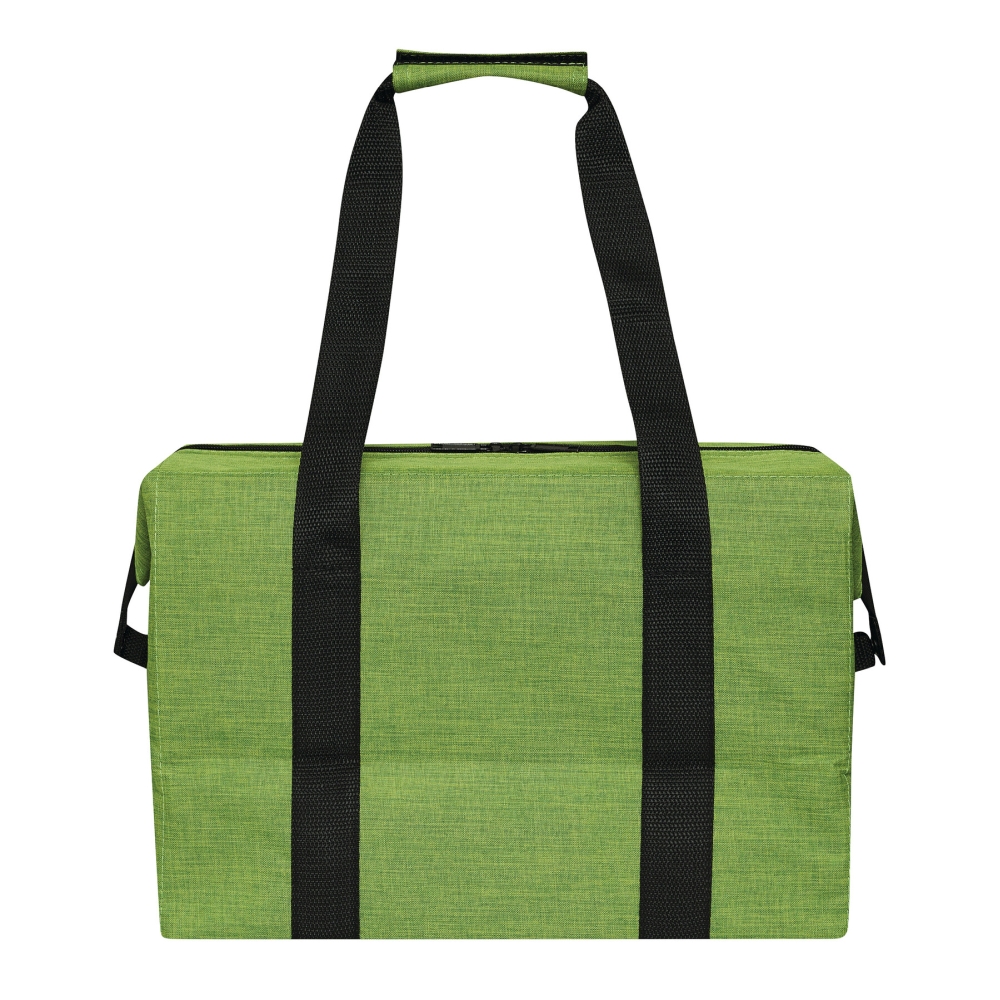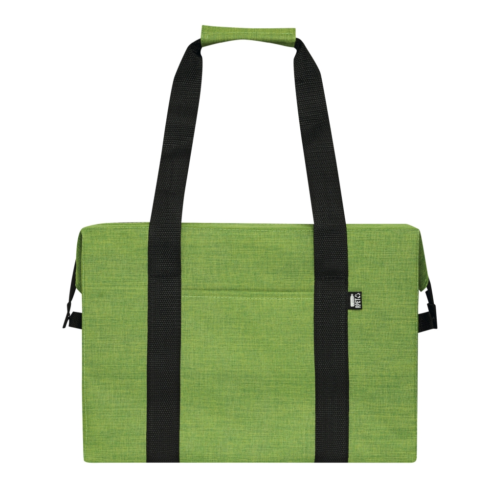 Cooler bag POLAR: made of recycled plastic (RPET), insulated main compartment with 2-way zip, 1 slip-in pocket on the front, reinforced carrying handles, expandable storage space by unsnapping top edges of the bag from the webbing loop attached at each side. Dimensions: 59 x 19 x 44 cm
