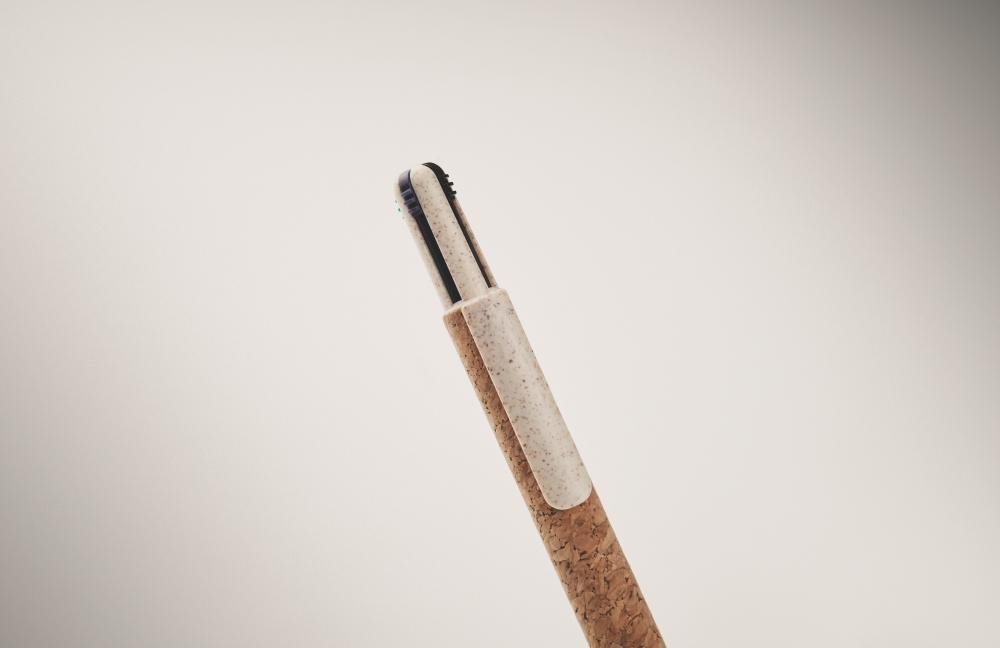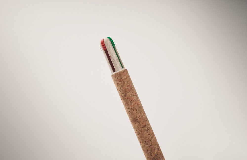Push button 4-colour ink ball pen with cork barrel and wheat straw (50%) and ABS plastic (50%) fittings. Dimensions: O 1,3 x 14,3 cm