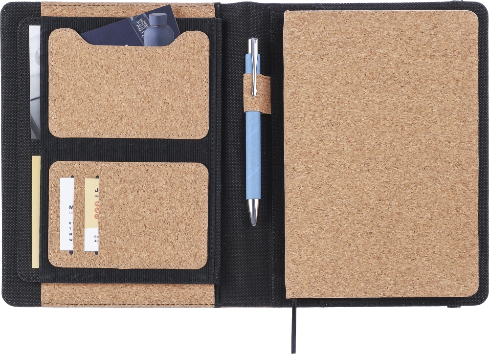 Cork portfolio, approx. A5 size. With inside pockets, elastic closure band, pen loop, and removable A5 notebook with 192 lined recycled paper sheets (70 gsm). Packaged in tissue paper. Dimensions: 21 x 28 x 4,2 cm
