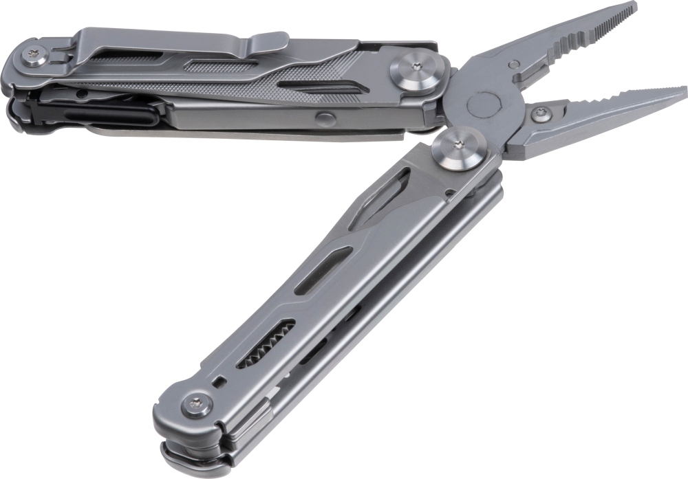 CrisMa 15-piece multifunctional tool made of stainless steel and various tools such as pliers, knife, saw, scissors, screwdriver etc. and practical clip for attaching to the belt. This item is supplied in a black box. Your logo will be engraved on the handle. Dimensions: 16,2 x 2,2 x 5,7 cm