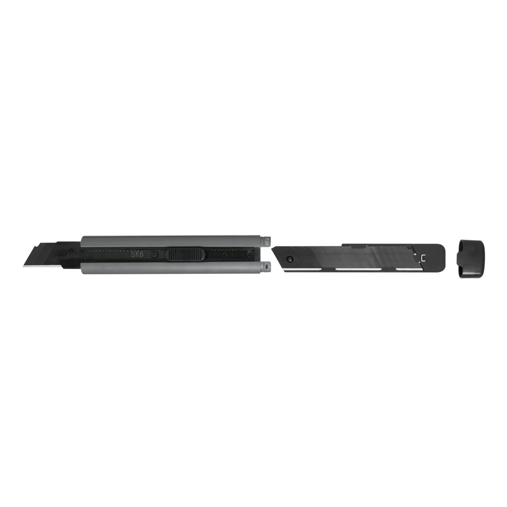 Cutter knife with flexible black 18 mm snap-off blade (10 blade segments and a spare blade), auto-stop slider, plastic casing, and steel blade guide, for light to heavy cutting, in a box. Dimensions: 16,5 x 2,8 x 1,5 cm