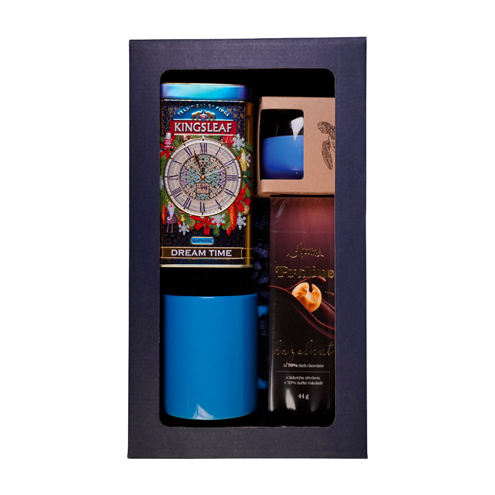 DARELA BLUE Sada obsahující francouzské sušenky, čaj, svíčku a modrý hrnek, v dárkové krabici