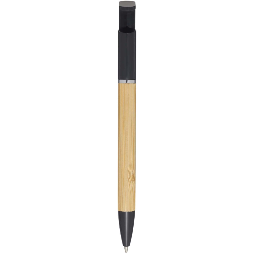 Bamboo ballpoint pen that also functions as a phone holder. The button and mid ring are made of recycled plastic, the tip is made of brass, and the barrel is made of responsibly sourced bamboo. Ink colour: Blue. Writing length: 1000 metres. Nib size: 1.0 mm. Dimensions: 14,7 x O 1 cm