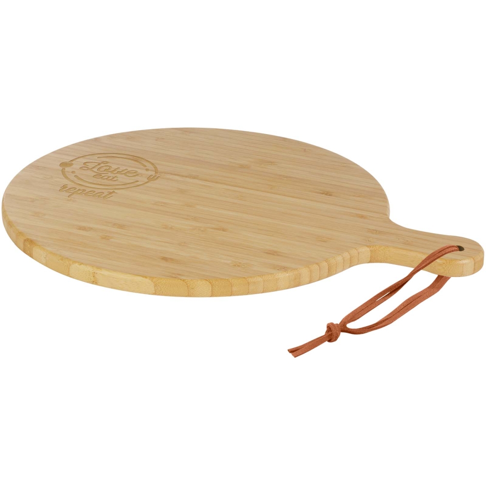The Delys cutting board is made from bamboo, ideal for individuals and businesses who opt for a more sustainable choice. Board diameter: 30.5 cm. Handle length: 8 cm. Board thickness: 1.4 cm. Not suitable for microwave or dishwasher. Dimensions: 39,2 x 1,4 x 30,6 cm
